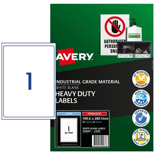 Avery Identification Laser Heavy Duty White L7067 199.6 x 289.1mm 1UP 25 Labels