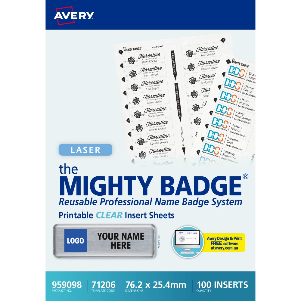 • Use with Avery Mighty Badge Name Badge System. Refill contains 5 insert sheets with 20 clear inserts per sheet, including 100 clear inserts in total.