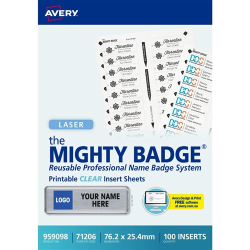 Avery Mighty Badge Printable Inserts Laser Clear 71206 76.2 x 25.4 mm 20UP 100 Inserts