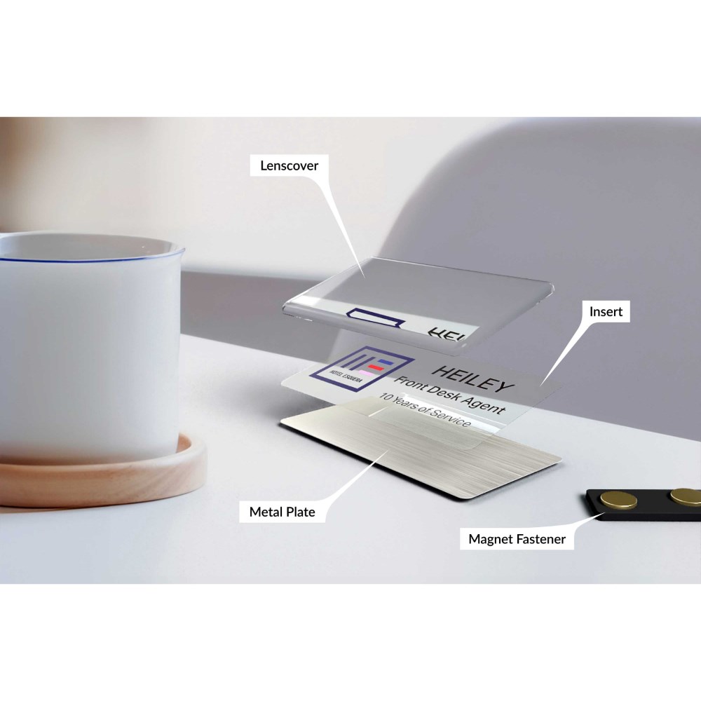 • Name badges can be used and reused for every occasion by simply replacing inserts.