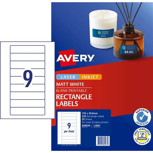 • Size: 133x29.61mm 225 labels, 25 sheets. 9 labels per sheet (9UP).