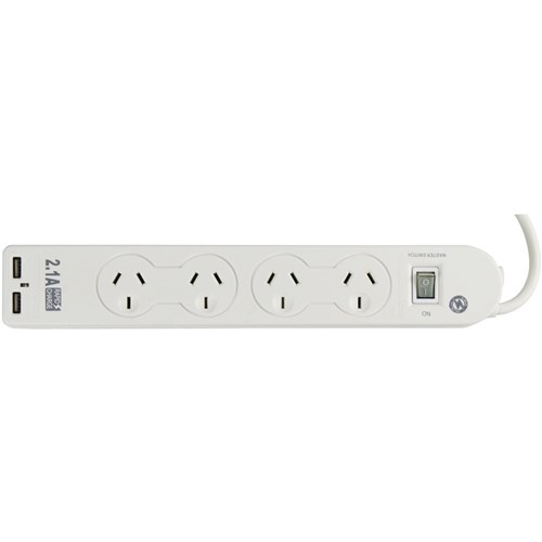 Italplast 4 Outlet Powerboard Master Switch Surge Overload Protection And 2 USB White