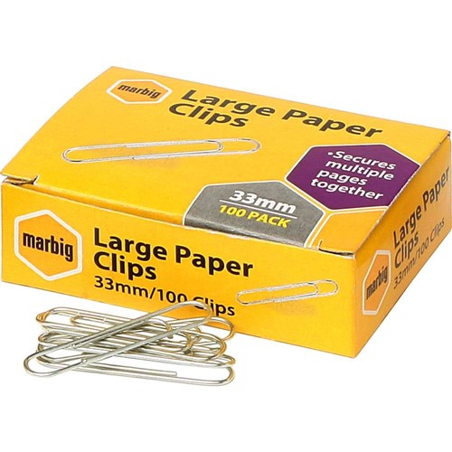 Marbig Paper Clips Large 33mm Chrome Box Of 100