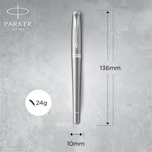 • Metallic finish with a lightly brushed touch complemented by chrome trim and the signature Parker arrow clip.