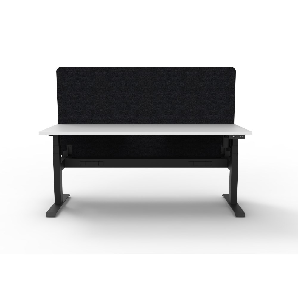 • Electric height adjustable single sided workstation with Natural White top and Black Satin frame, Black Eco screen and cable tray.