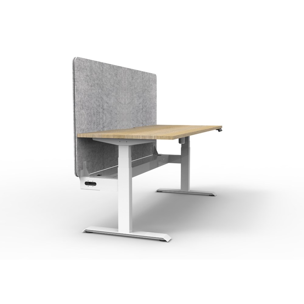 • Electric height adjustable single sided workstation with Natural Oak top and White Satin frame, Grey Eco screen and cable tray.