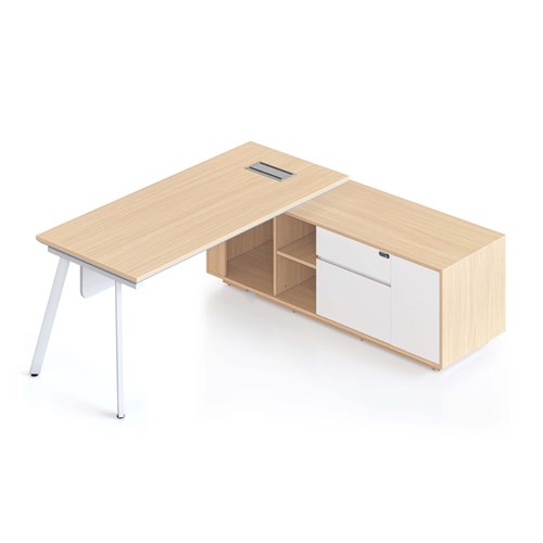 • Natural Oak top and White Satin frame. Executive desk with Eternity legs, modesty panel and right hand side cabinet.
