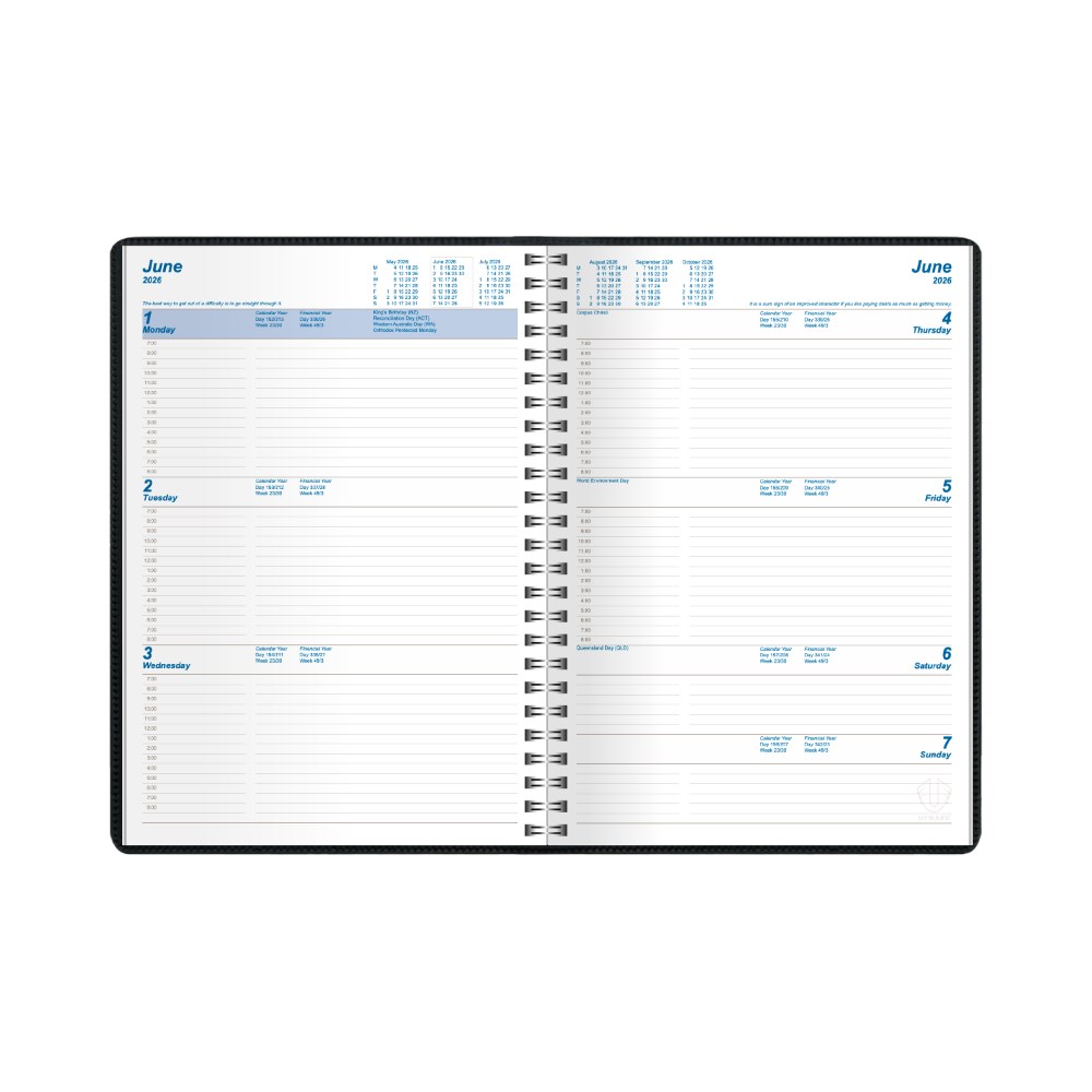 • Featuring a padded, phthalate free, PVC cover, pockets for storing business cards and wire-o binding to allow the diary to lie completely flat when open.