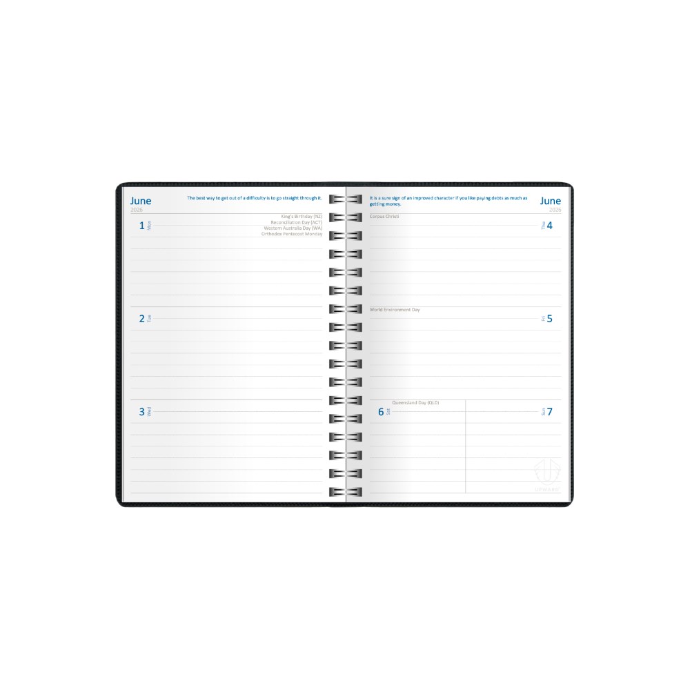 • Featuring a padded, phthalate free, PVC cover, pockets for storing business cards and wire-o binding to allow the diary to lie completely flat when open.